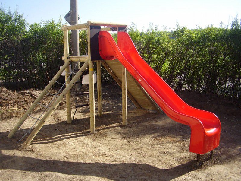Popis zariadenia: Drevené časti konštrukcie sú vyrobené zo smrekovej mimostrednej guľatiny bez trhlín o 100, o 90mm a polkolov 100/50mm. Všetko použité drevo je tlakovo impregnované Wolmanitom CX 10 a zbrúsené do hladka. Podesta a príruba šmýkalky sú vyrobené z bukovej vodeodolnej preglejky hr. 21 a 18mm. Okraje preglejky sú zbrúsené a zatrené farbou do exteriéru. Použité laná sú vyrobené z polypropylénu hr. 18mm. Sieť je vyrobená na mieru z nerezovej reťaze. Všetok spojovací materiál je zinkovaný. Šmýkalka je laminátová s certifikátom STN EN 1176:2018. Všetky spoje sú kryté plastovými záslepkami. Nosné aj boční nosné stĺpiky sú osadené v kovových pätkách, ktoré sú obstarané povrchovou úpravou epoxidovou práškovou farbou – Komaxit.