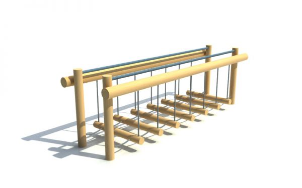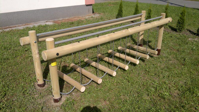 Popis zariadenia: Zariadenie je tvorené 4ks nosných stĺpikov zo smrekovej mimostrednej guľatiny bez trhlín o 100mm, 2ks vodorovných nosných prvkov chodníku zo smrekovej mimostrednej guľatiny o 120mm a 7ks nášľapných vodorovných kolov zo smrekovej mimostrednej guľatiny o 90mm. Všetko použité drevo je tlakovo imregnované Wolmanitom CX 10 a zbrúsené do hladka. Vodorovné madlo je vyrobené z pozinkovanej rúry s dodatočným antikoróznym náterom v šedej farbe. Reťaze použité na zavesenie poréznych kolov sú z nerezu. Všetok spojovací materiál je zinkovaný. Nosné stĺpiky sú osadené v kovových pätkách, ktoré sú opatrené povrchovou úpravou epoxidovou práškovou farbou – Komaxit.