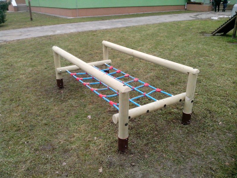 Popis zariadenia: Drevené časti konštrukcie sú vyrobené zo smrekovej mimostrednej guľatiny bez trhlín o 100mm. Všetko použité drevo je tlakovo impregnované Wolmanitom CX 10 a zbrúsené do hladka. Sieť je vyrobená na mieru z kordového lana o 18mm s jadrovým lanom a opletom. Kríženie lán je urobené pomocou špeciálnych profilov HUCK a konce sú zalisované v kovovej, guľatej koncovke so závitovou tyčou o 8mm. Spojovací materiál je zinkovaný. Všetky spoje sú kryté plastovými záslepkami. Nosné stĺpiky sú osadené v kovových pätkách, ktoré sú ošetrené povrchovou úpravou epoxidovou práškovou farbou – Komaxit.