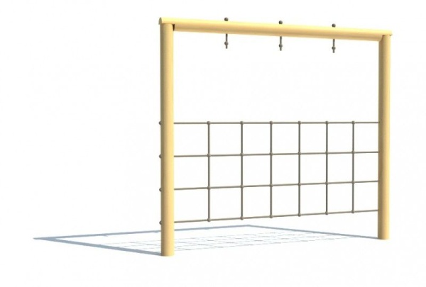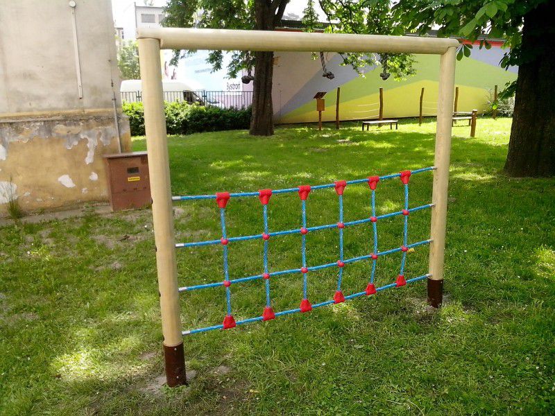 Popis zariadenia: Drevené časti konštrukcie sú vyrobené zo smrekovej mimostrednej guľatiny bez trhlín o 100mm. Všetko použité drevo je tlakovo impregnované Wolmanitom CX 10 a zbrúsené do hladka. Sieť je vyrobená na mieru z kordového lana o 18mm s jadrovým lanom a opletom. Kríženie lán je urobené pomocou špeciálnych profilov HUCK a konce sú zalisované v kovovej, guľatej koncovke so závitovou tyčou o 8mm. Spojovací materiál je zinkovaný. Všetky spoje sú kryté plastovými záslepkami. Nosné stĺpiky sú osadené v kovových pätkách, ktoré sú ošetrené povrchovou úpravou epoxidovou práškovou farbou – Komaxit.