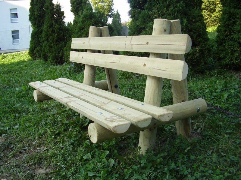 Popis zariadenia: Drevené časti konštrukcie lavičky sú vyrobené zo smrekovej mimostrednej guľatiny bez trhlín o 100 mm a polkolov 100/50mm. Všetko použité drevo je tlakovo impregnované Wolmanitom CX 10 a zbrúsené do hladka. Všetok spojovací materiál je zinkovaný. Všetky spoje sú kryté plastovými záslepkami. Nosné stĺpiky sú osadené v kovových pätkách do betónového základu. Kovové pätky sú obstarané povrchovou úpravou epoxidovou práškovou farbou – Komaxit.