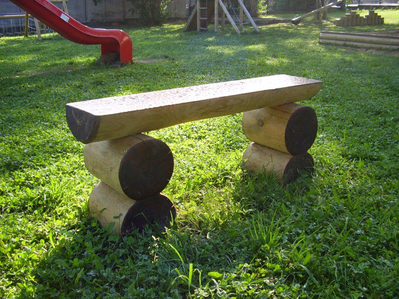Popis zariadenia: Lavička je vyrobená zo smrekovej stredovej guľatiny o 190 – 230 mm. Všetko je tlakovo imregnované Wolmanitom CX 10 a zbrúsené do hladka. Horné a bočné rezné plochy sú ošetrené trojitým náterom Xyladecor Top Glazúra odtieň orech. Lavička je ukotvená do betónového základu pomocou 4 ks kovových pätiek, ktoré sú opatrené povrchovou úpravou epoxidovou práškovou farbou – Komaxit.