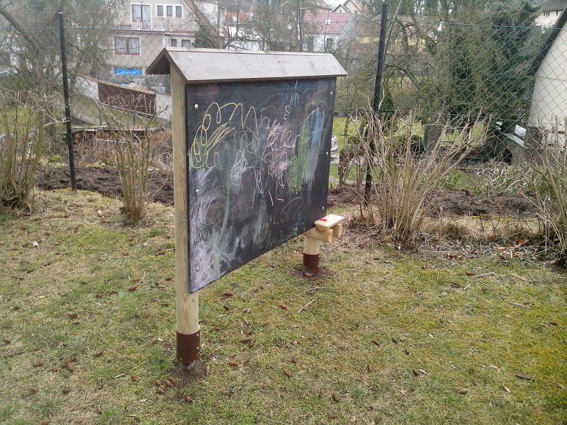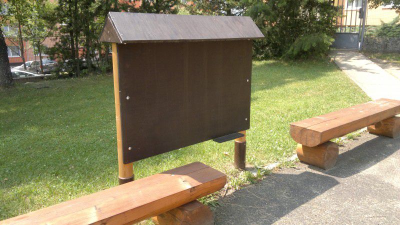 Popis zariadenia: Drevené časti konštrukcie sú vyrobené zo smrekovej mimostrednej guľatiny bez trhlín o 100 mm. Všetko je tlakovo impregnované Wolmanitom CX 10 a zbrúsené do hladka. Plocha tabule je vytvorená z bukovej vodeodolnej preglejky hr. 18 mm. Okraje preglejky sú zbrúsené a zatrené farbou do exteriéru. Plocha tabule je obstaraná špeciálnym náterom tabuľovou farbou. Všetok spojovací materiál je zinkovaný. Spoje sú kryté plastovými záslepkami. Nosné stĺpiky sú osadené v kovových pätkách, ktoré sú opatrené povrchovou úpravou epoxidovou práškovou farbou – Komaxit.