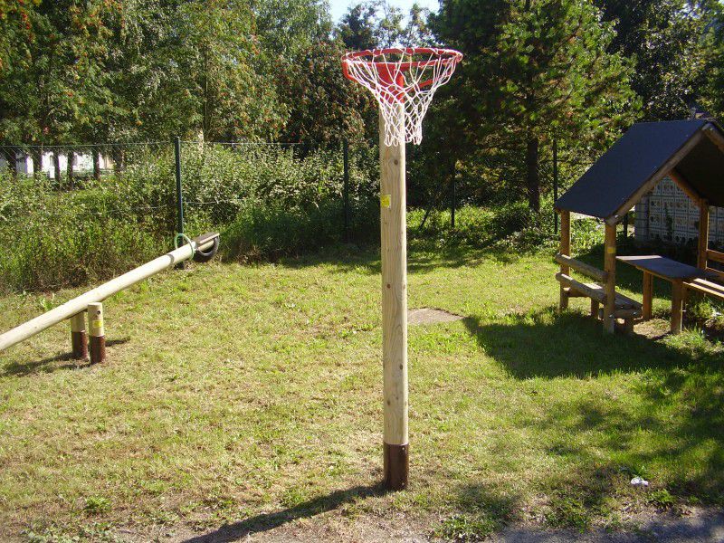 Popis zariadenia: Drevené časti konštrukcie sú vyrobené zo smrekovej mimostrednej guľatiny bez trhlín o 120 mm. Všetko je zbrúsené do hladka a ošetrené tlakovou impregnáciou Wolmanit CX 10. Všetok spojovací materiál je zinkovaný. Vrchná časť je kovová s povrchovou úpravou epoxidovou práškovou farbou – Komaxit. Sieťka je pletená z nylonu. Nosný stĺpik je osadený do betónového základu na kovovej pätke, ktorá je tiež ošetrená povrchovou úpravou epoxidovou práškovou farbou – Komaxit.